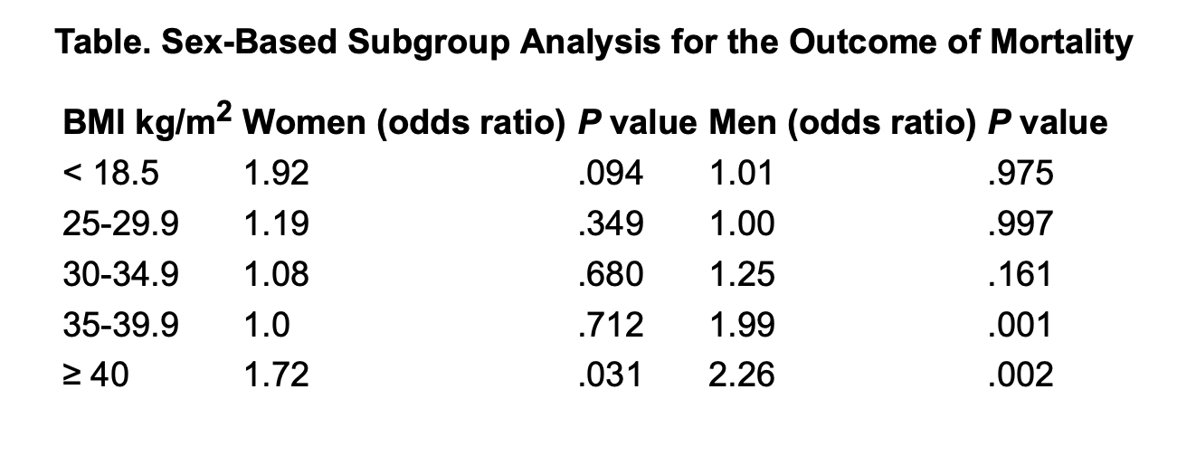The odds ratios (ORs) for in-hospital death were higher for men of a given BMI than women (compared with the reference group of a BMI of 18.5-24.9 kg/m2), even after adjusting for other potential confounders, such as age, hypertension, diabetes, coronary artery disease, and chronic kidney disease (Table). Table. Sex-Based Subgroup Analysis for the Outcome of Mortality