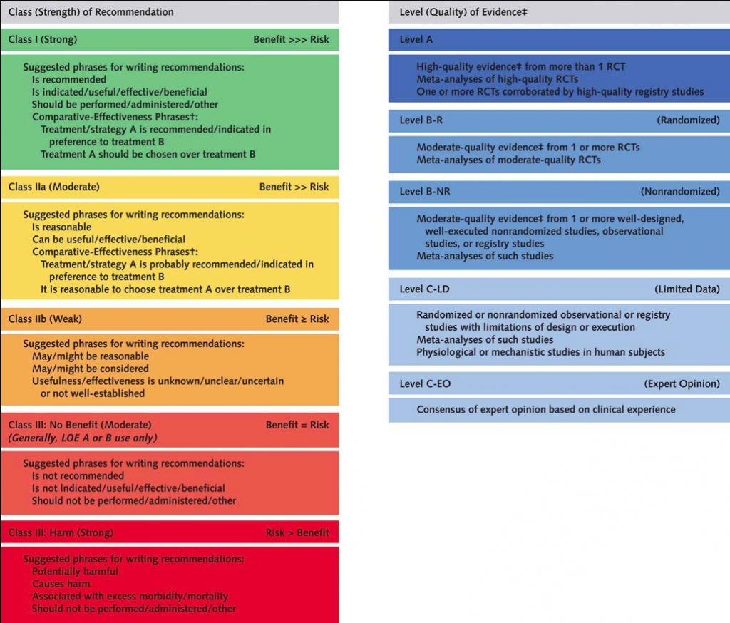 COR and LOE are determined independently (any COR may be paired with any LOE). A recommendation with LOE C does not imply that the recommendation is weak. Many important clinical questions addressed in guidelines do not lend themselves to clinical trials. Although RCTs are unavailable, there may be a very clear clinical consensus that a particular test or therapy is useful or effective. (Reproduced with permission of the American College of Cardiology and the American Heart Association.) COR = class (strength) of recommendation; EO = expert opinion; LD = limited data; LOE = level (quality) of evidence; NR = nonrandomized; R = randomized; RCT = randomized controlled trial.