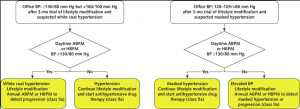 Algorithm for detection of white coat hypertension or masked hypertension in patients not receiving antihypertensive drug therapy.