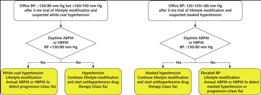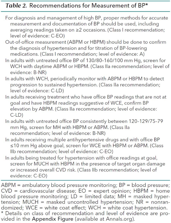 Colors correspond to class of recommendation in the Appendix Figure. (Reproduced with permission of the American College of Cardiology and the American Heart Association.) ABPM = ambulatory blood pressure monitoring; BP = blood pressure; HBPM = home blood pressure monitoring.