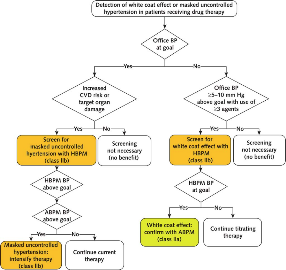 Algorithm for detection of white coat effect or masked uncontrolled hypertension in patients receiving drug therapy.