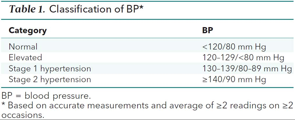 Table 1 shows BP classifications. Although the definition of normal BP remains the same as in JNC 7 (average systolic BP [SBP] <120 mm Hg and average diastolic BP [DBP] <80 mm Hg), the 2017 guideline replaces the term “prehypertension” with “elevated BP” (average SBP of 120 to 129 mm Hg and average DBP <80 mm Hg) and “stage 1 hypertension” (average SBP of 130 to 139 mm Hg or average DBP of 80 to 89 mm Hg). Stage 2 hypertension is defined as an average SBP of at least 140 mm Hg or an average DBP of at least 90 mm Hg instead of a BP of at least 160/100 mm Hg. The upper end of prehypertension was reclassified as stage 1 hypertension because adults with BP in this range have an approximately 2-fold increase in CVD risk compared with adults with normal BP, and recent randomized clinical trials have demonstrated benefit with an SBP below 130 mm Hg (9–13). This change in BP classification is estimated to result in an increase of about 14% in the prevalence of hypertension in the United States but only a 1.9% increase in adults requiring antihypertensive drug therapy (14).