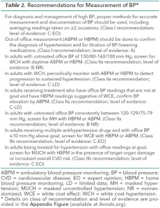 Proper methods of BP measurement, which are detailed in the guideline (4), are fundamental to categorizing BP, ascertaining BP-related CVD risk, and managing hypertension. The guideline urges clinicians to obtain accurate measurements and base their estimates of BP on an average of at least 2 readings obtained on at least 2 separate occasions (Table 2).