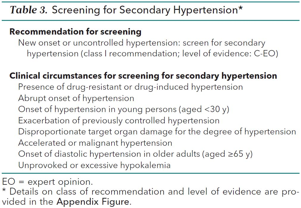 A secondary cause of hypertension can be identified in approximately 10% of hypertensive adults, and specific treatment of the cause reduces CVD risk. Screening for a secondary cause is recommended in the circumstances listed in Table 3, with referral to a clinician with relevant expertise when screening results are positive.