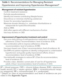 Treatment of resistant hypertension includes maximization of diuretic therapy (chlorthalidone or indapamide instead of hydrochlorothiazide), addition of a mineralocorticoid receptor antagonist (spironolactone or eplerenone), addition of mineralocorticoid receptor antagonist (spironolactone or eplerenone), addition of other agents with different mechanisms of action, use of loop diuretics in patients with CKD, and referral to a hypertension specialist if BP remains uncontrolled (Table 5).