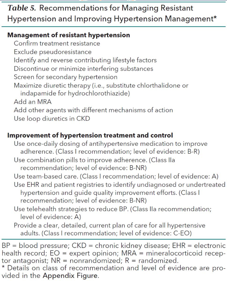 Resistant hypertension is defined as an average office BP of 130/80 mm Hg or higher in patients adhering to 3 or more antihypertensive agents from different classes at optimal doses, including a diuretic, or in those requiring 4 or more antihypertensive medications. Using the former BP target of less than 140/90 mm Hg, the prevalence of resistant hypertension has been estimated to be 13% among hypertensive adults. Estimates suggest that the prevalence of resistant hypertension will be about 4% higher with the new BP target of less than 130/80 mm Hg (4). Risk for myocardial infarction, stroke, end-stage renal disease, and death in adults with resistant hypertension (using the previous definition) is 2- to 6-fold higher than in adults with hypertension that is not resistant to treatment. Clinicians caring for patients who fulfill the criteria for resistant hypertension should ensure that the diagnosis is based on accurate office BP measurements, assess for nonadherence to the prescribed antihypertensive medications, and obtain home or ambulatory BP readings to rule out the white coat effect. Contributing lifestyle factors should be identified and addressed. Use of substances that interfere with antihypertensive therapy, such as nonsteroidal anti-inflammatory drugs, stimulants, and oral contraceptives, should be discontinued or minimized, and secondary causes of hypertension should be excluded.