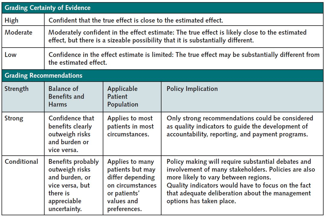 This guideline was developed by ACP’s CGC according to ACP’s guideline development process, details of which may be found in ACP’s methods paper (13). The CGC used the GRADE (Grading of Recommendations Assessment, Development and Evaluation) tables in the accompanying systematic review (12) when reporting the evidence and graded the recommendations using GRADE methodology (14, 15) (Figure 1). The accompanying GRADE Evidence to Decision tables illustrate the Evidence to Decision framework supporting the recommendations (Supplement 2).