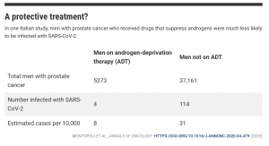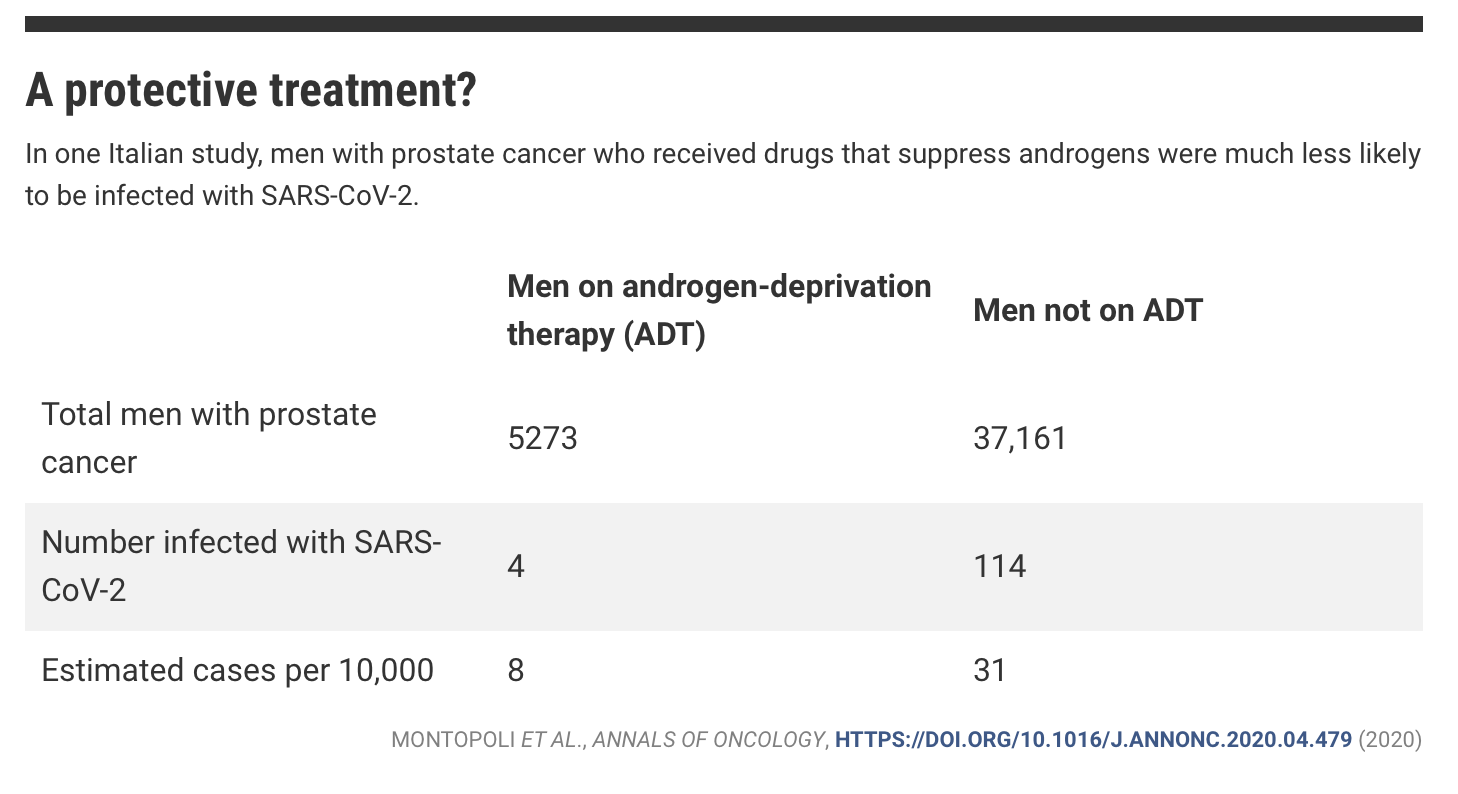 In one Italian study, men with prostate cancer who received drugs that suppress androgens were much less likely to be infected with SARS-CoV-2.